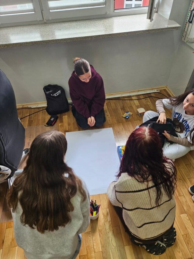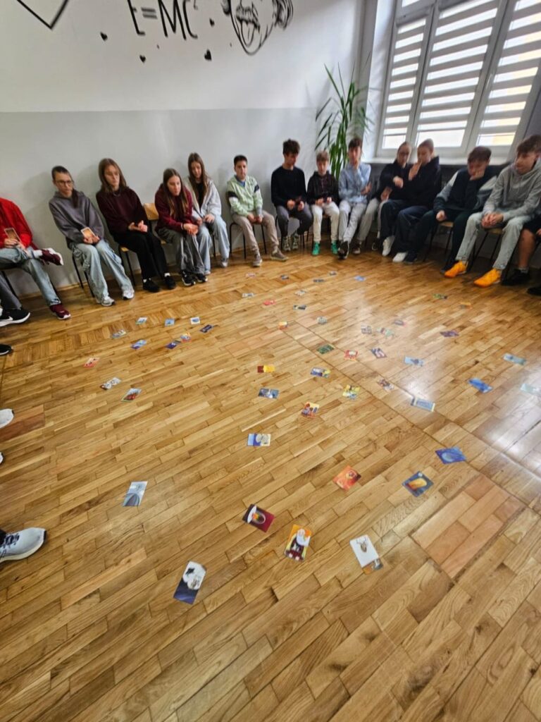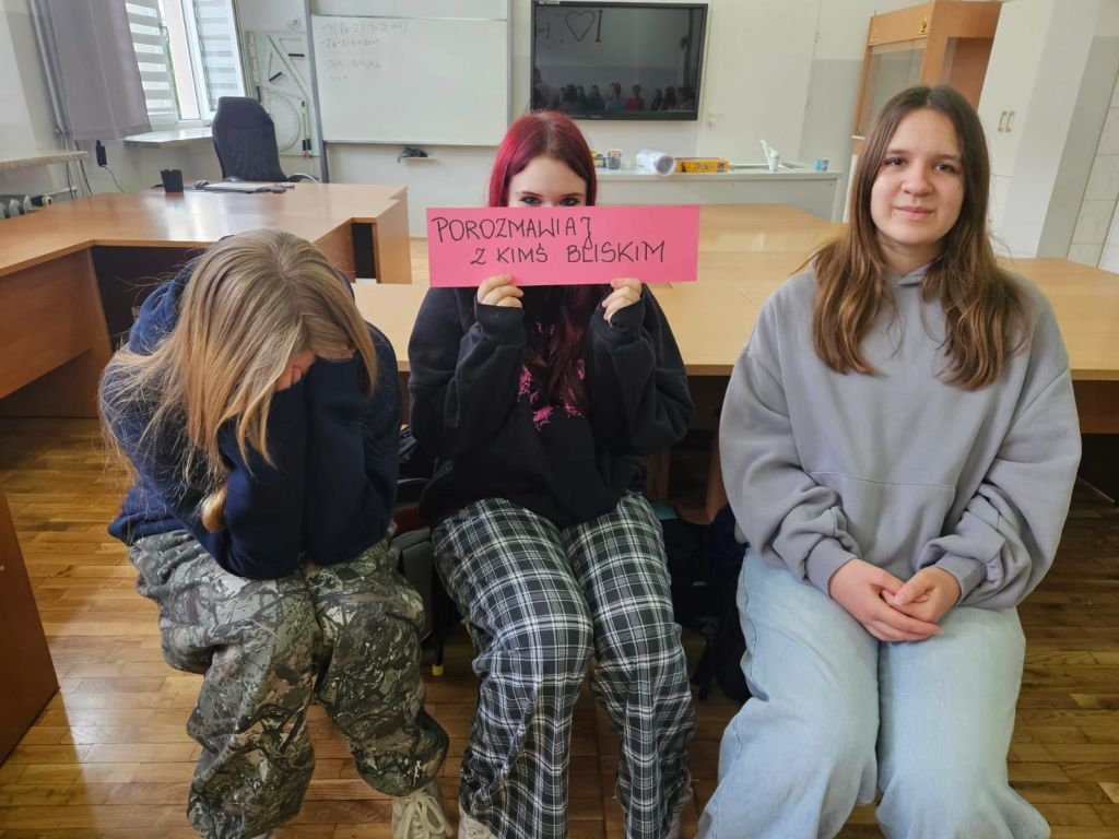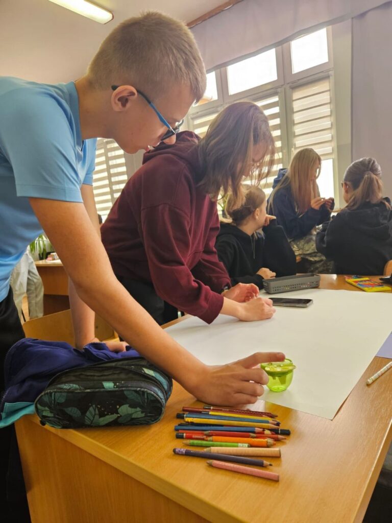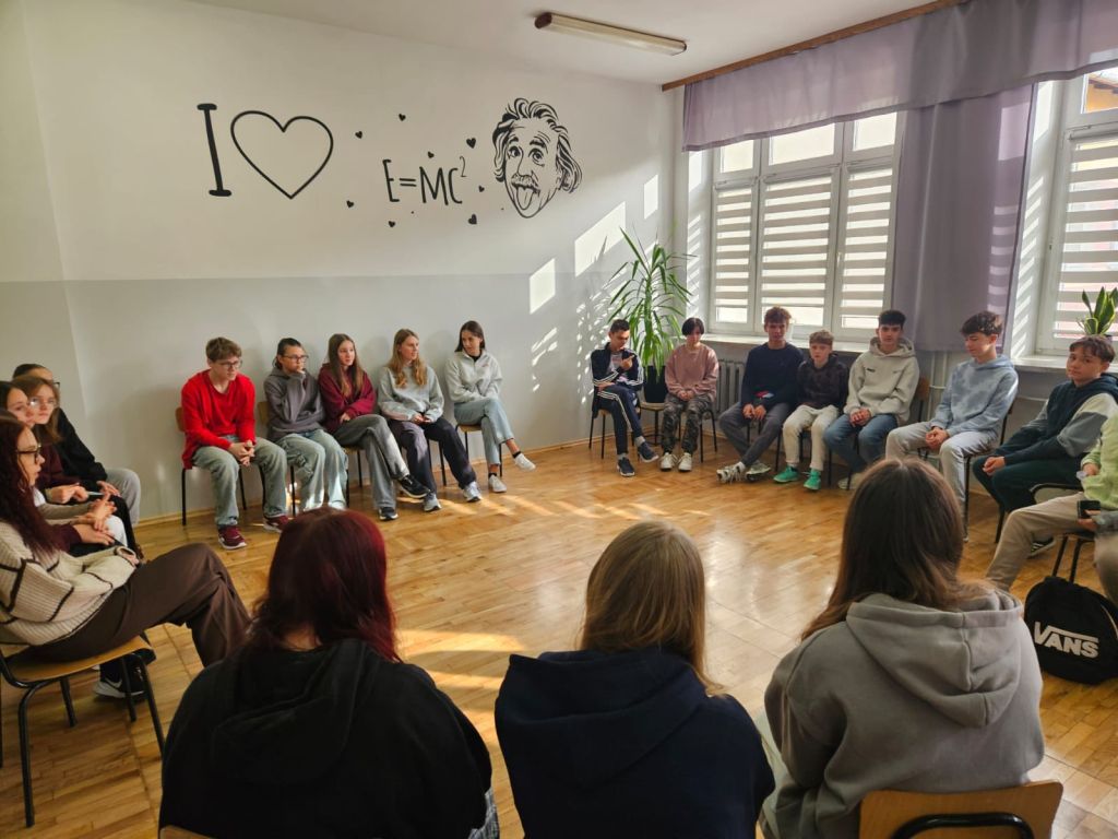 Podczas warsztatów poruszane były najważniejsze obszary związane z dobrostanem psychicznym – uczniowie wspólnie zastanawiali się, co wpływa na ich samopoczucie, co pomaga zachować spokój i komfort, a także jakie działania sprzyjają zdrowiu psychicznemu każdego dnia. W atmosferze otwartej rozmowy młodzież dzieliła się swoimi przemyśleniami, potrzebami i pomysłami na to, jak troszczyć się o siebie.