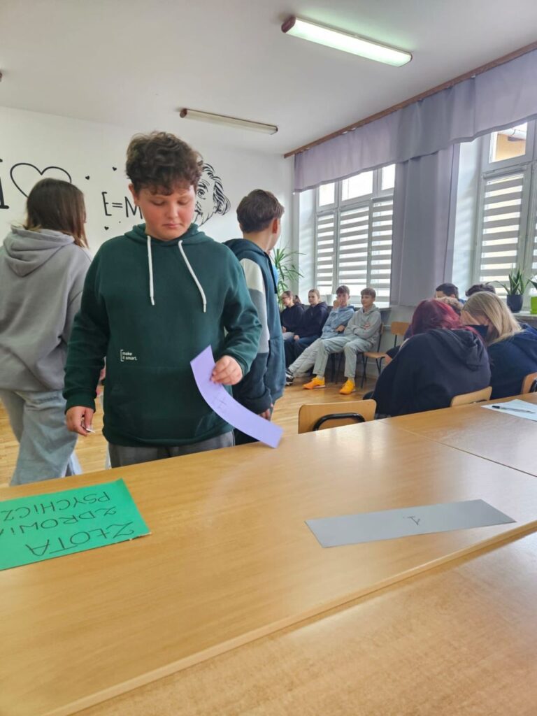 Uczniowie z dużym zaangażowaniem i skupieniem uczestniczyli w zajęciach, które uświadomiły im, jak ważne jest dbanie o zdrowie psychiczne w codziennym życiu. Mamy nadzieję, że każdy z nas zapamięta zasady „Złotej 7-ki” i będzie je stosował każdego dnia.