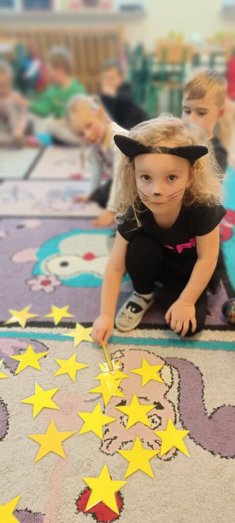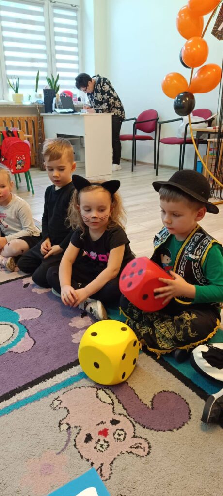 Na zdjęciach widać, że wyobraźnia nie miała granic! Wśród uczestników zabawy można było spotkać urocze czarne kotki, małych czarodziejów w kapeluszach, a nawet superbohaterów i duszki. Dużym zainteresowaniem cieszyła się zabawa z „czarodziejską różdżką” i rozsypanymi na dywanie złotymi gwiazdami, a także rzuty wielką, kolorową kostką.