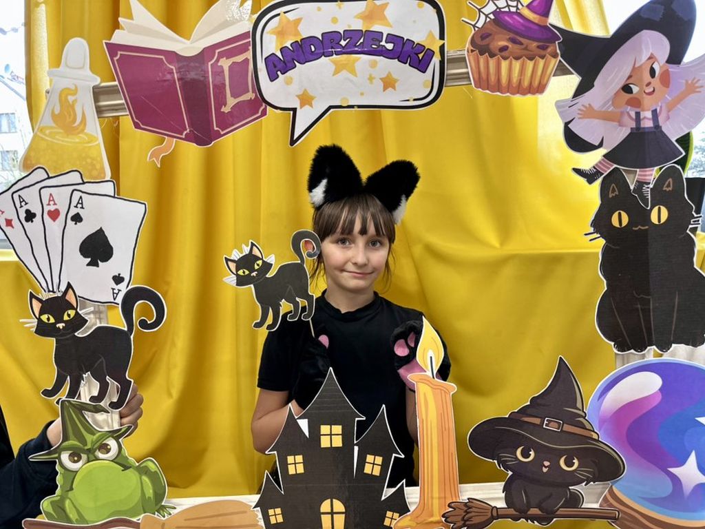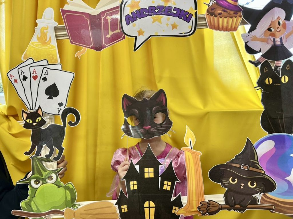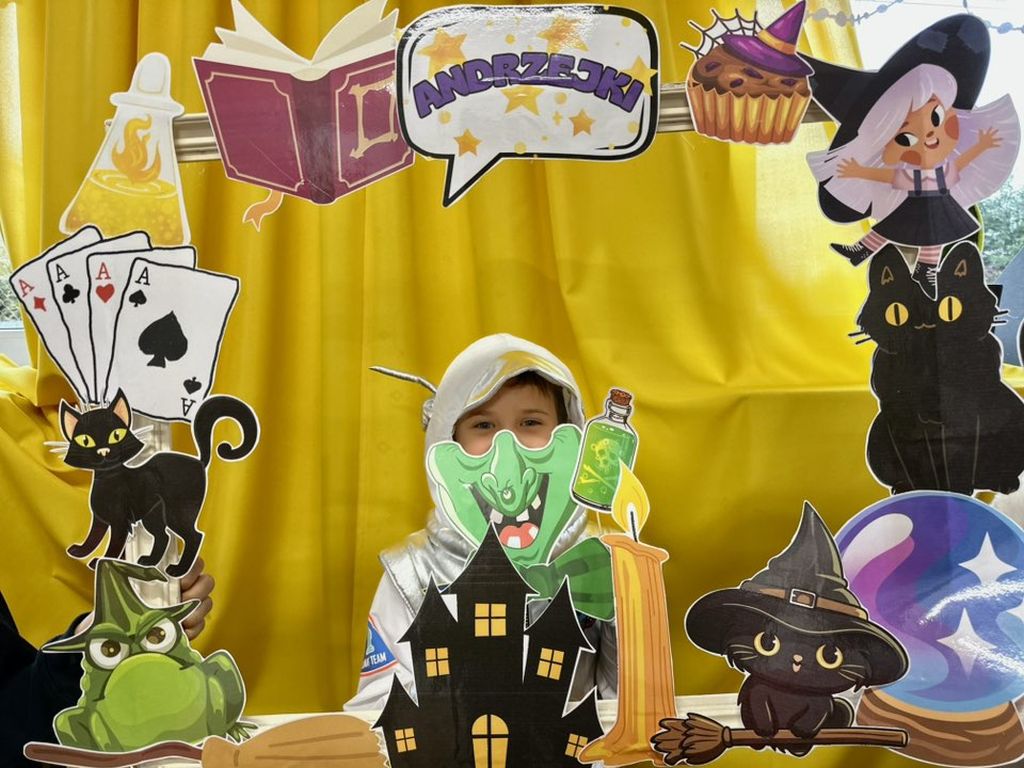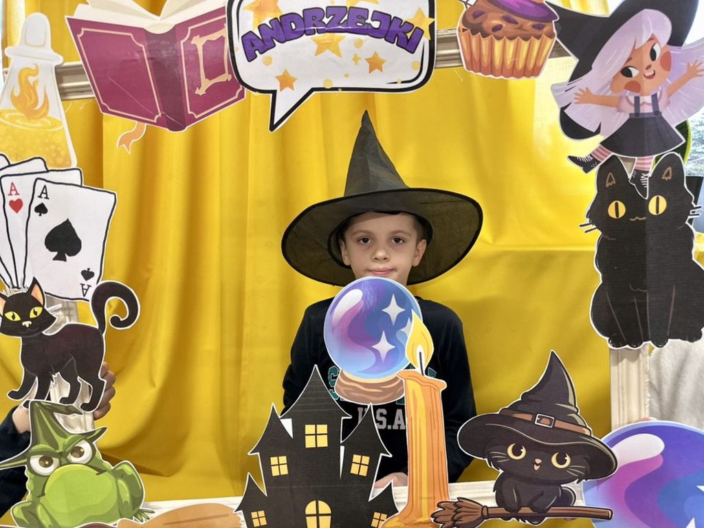 Prawdziwym hitem imprezy okazała się andrzejkowa fotoramka. Uczniowie chętnie pozowali do pamiątkowych zdjęć, wykorzystując zabawne rekwizyty – maski, wąsy, kapelusze czy wizerunki czarnych kotów i czarownic.