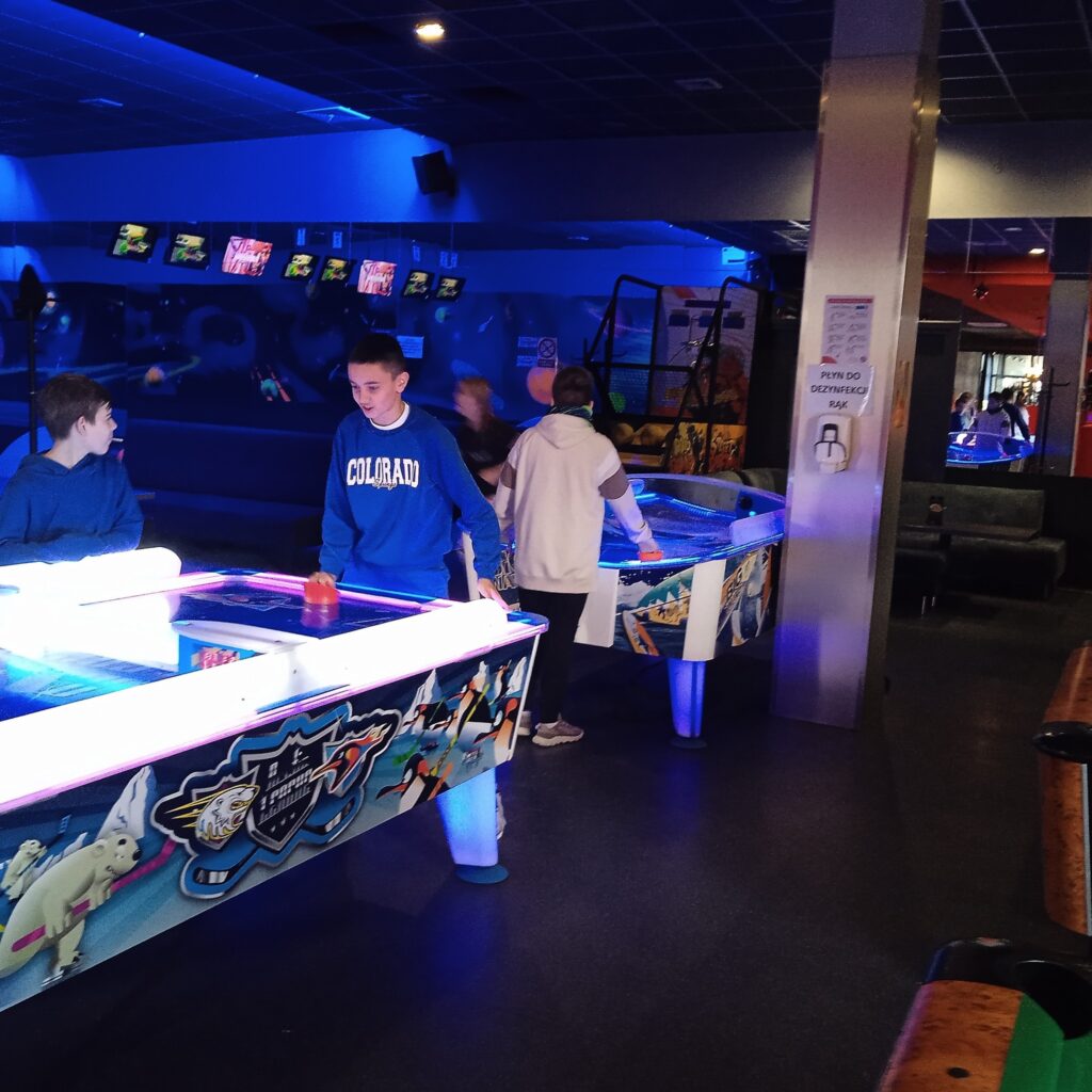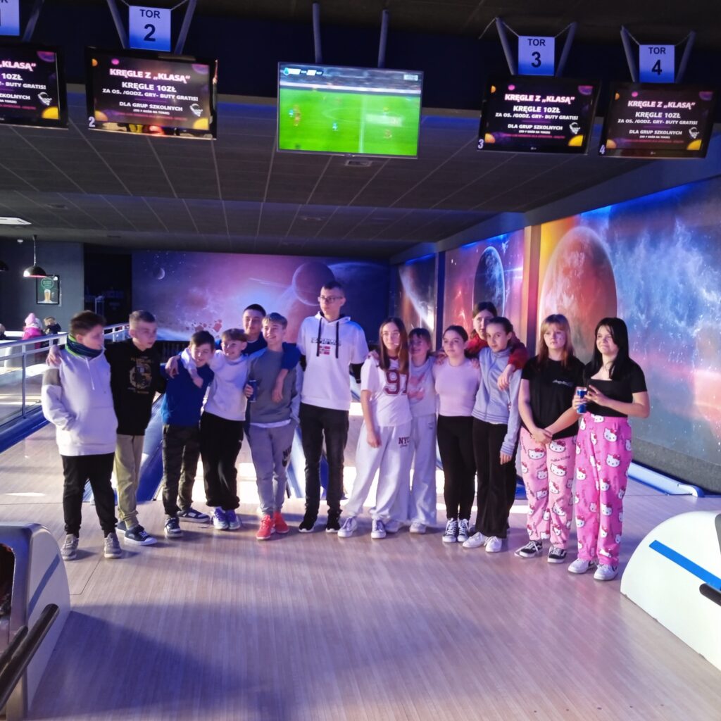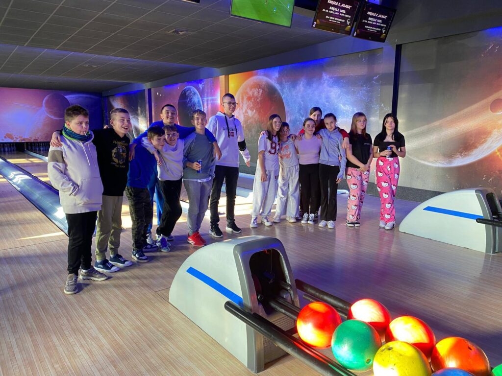 Na miejscu na uczniów czekała „kosmiczna” sceneria i wiele sportowych emocji. Uczestnicy wycieczki podzieleni na grupy rywalizowali na torach, doskonaląc swoje umiejętności bowlingowe. Nie zabrakło zdrowej rywalizacji, okrzyków radości po udanych rzutach oraz wzajemnego dopingu. Oprócz gry w kręgle, uczniowie korzystali również z innych atrakcji dostępnych w obiekcie, takich jak cymbergaj, co dodatkowo urozmaiciło czas spędzony w gronie rówieśników.