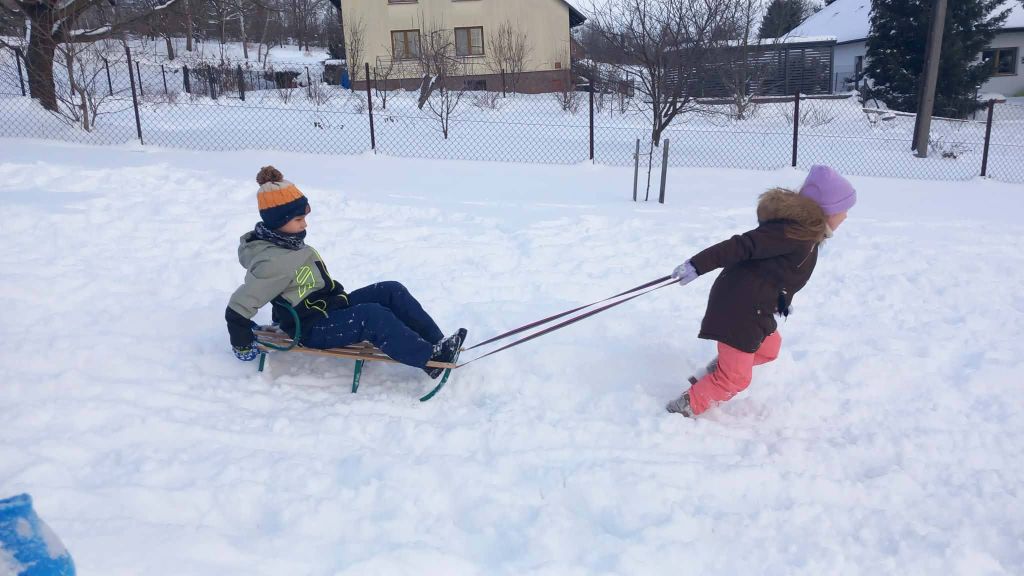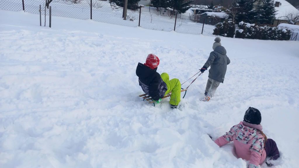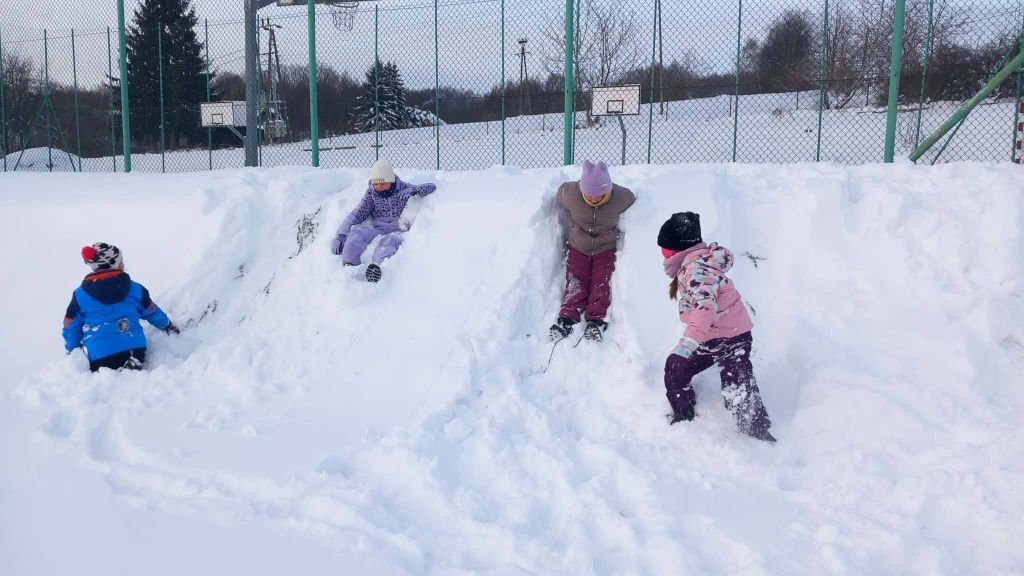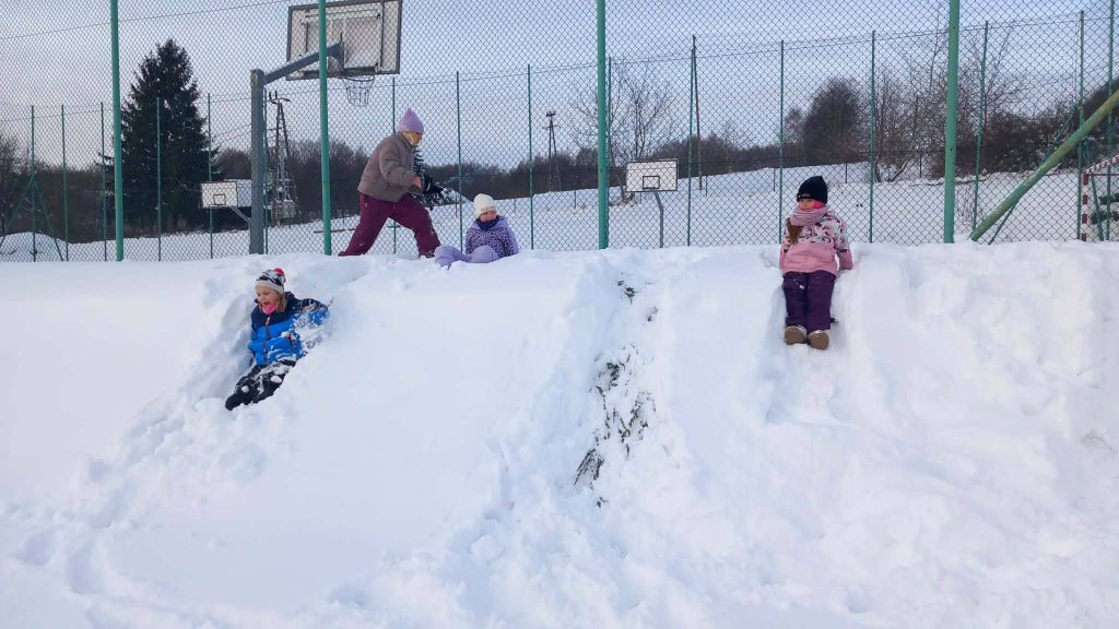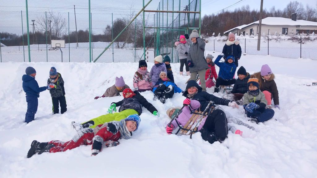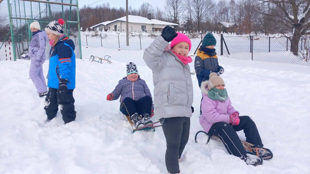 Lekcja w terenie okazała się strzałem w dziesiątkę. Na szkolnym boisku i pobliskich górkach nie brakowało radosnych zjazdów na sankach oraz wspólnych zabaw w głębokim śniegu. Uczniowie z ogromnym entuzjazmem oddali się zimowemu szaleństwu, co widać po szerokich uśmiechach na ich twarzach.