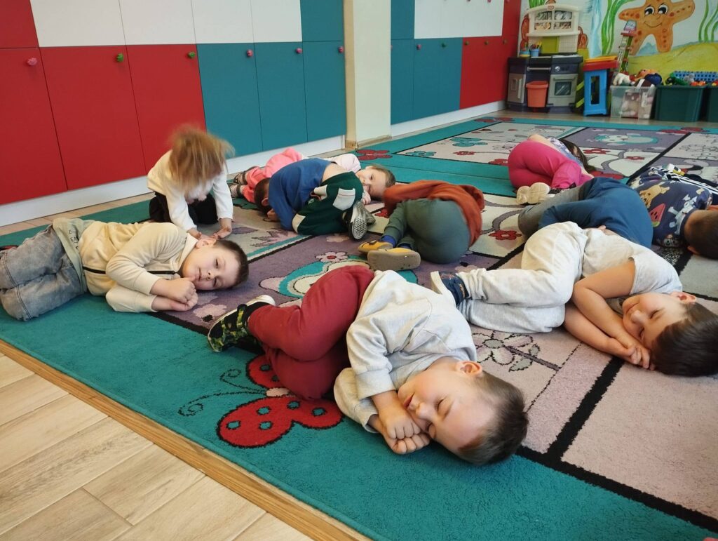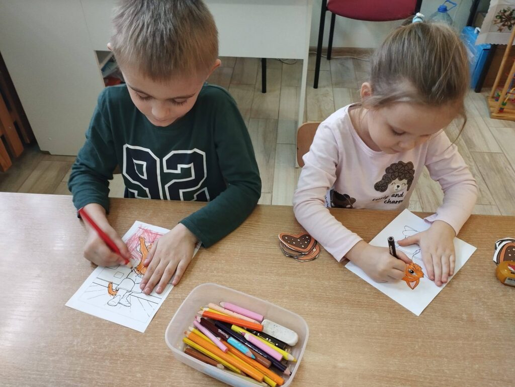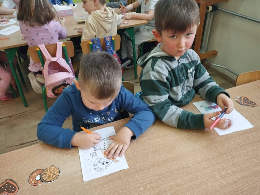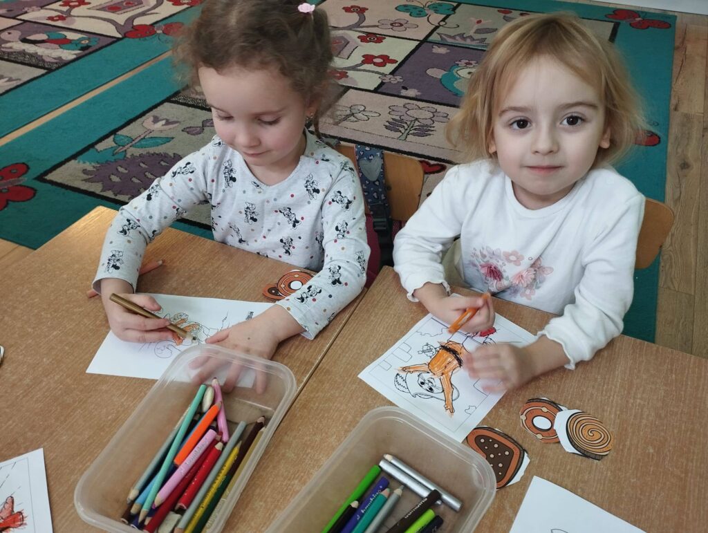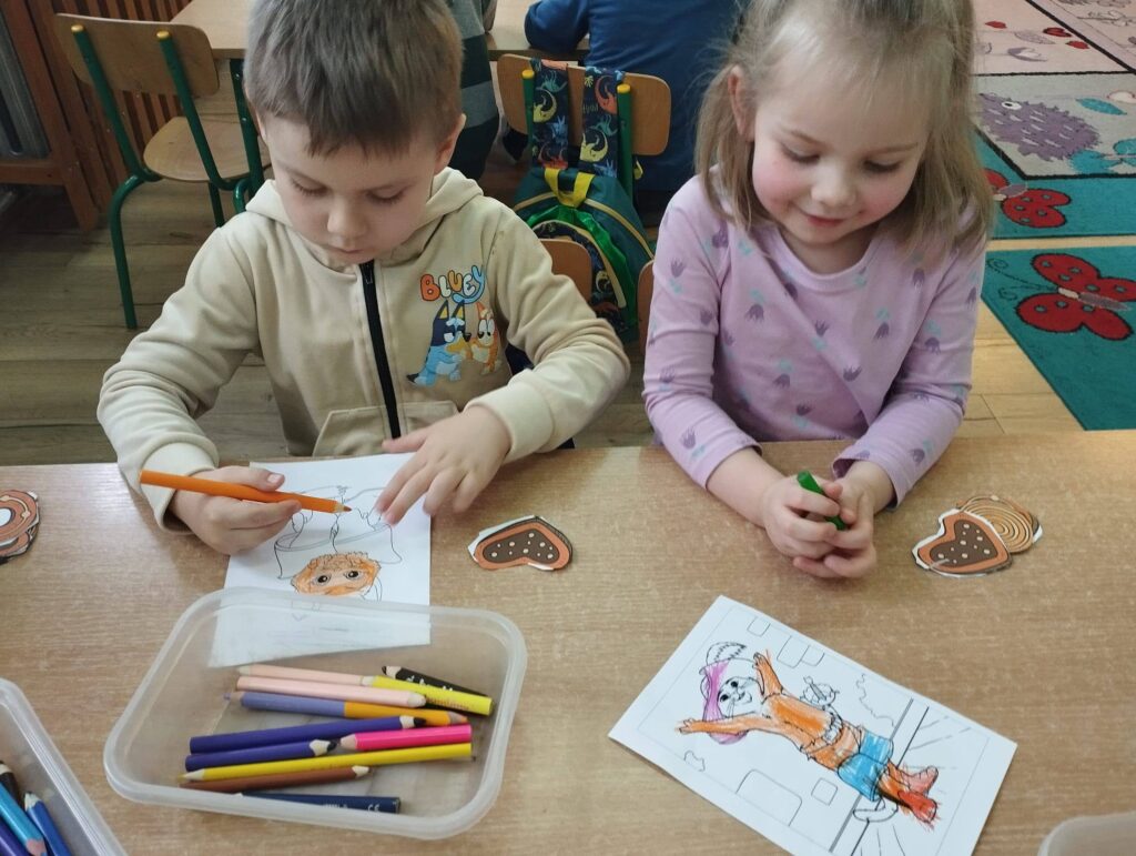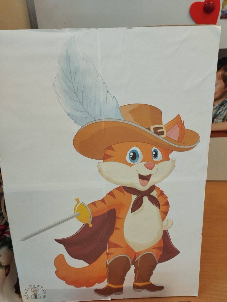 Jednak na samym słuchaniu się nie skończyło! Po lekturze przyszedł czas na aktywną zabawę. Przedszkolaki brały udział w zajęciach ruchowych, a następnie zasiadły do stolików, by przelać swoje wrażenia na papier. Powstały piękne, kolorowe prace plastyczne przedstawiające głównego bohatera – Kota w butach.