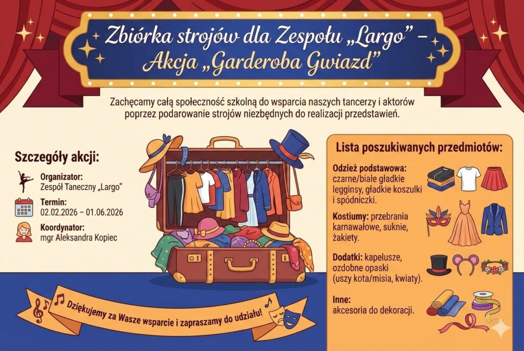 Szkolny Zespół Taneczny „Largo” ma przyjemność zaprosić uczniów, rodziców oraz nauczycieli do udziału w wyjątkowej inicjatywie pod nazwą „Garderoba Gwiazd”.