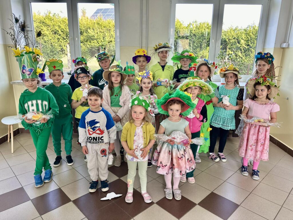 Szkolne korytarze na jeden dzień zamieniły się w prawdziwą wiosenną łąkę. Nasi uczniowie i przedszkolaki zaprezentowali niezwykle kreatywne kapelusze, opaski i cylindry. Wystarczy spojrzeć na pamiątkowe zdjęcie, by przekonać się o ogromnym rozmachu młodych projektantów! Zobaczyliśmy nakrycia głowy ozdobione bujnymi kwiatami, wiosennymi trawami, motylami, a nawet radosnymi żabkami i ptasimi piórami.