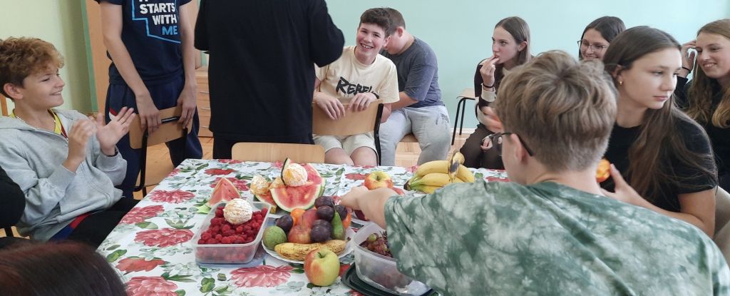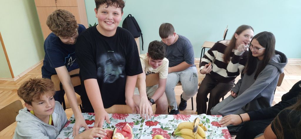 Na kolorowych talerzach znalazły się m.in. soczyste arbuzy, jabłka, banany, maliny, winogrona, mandarynki, śliwki oraz gruszki. Była to nie tylko smaczna lekcja zdrowego odżywiania, ale również świetna okazja do integracji zespołu klasowego w radosnej i swobodnej atmosferze.