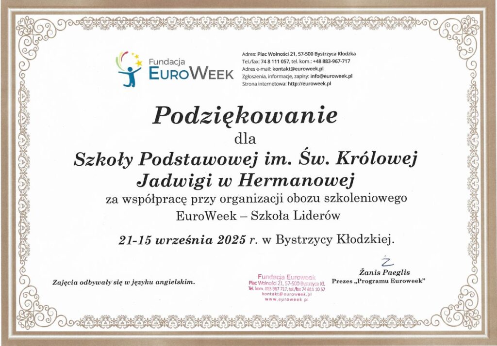 W dniach 21–25 września 2025 r. uczniowie naszej szkoły, pod opieką p. Karoliny Witek oraz p. Jacka Stryczka, uczestniczyli w wyjątkowym programie EuroWeek – Szkoła Liderów, który odbywał się w Bystrzycy Kłodzkiej.