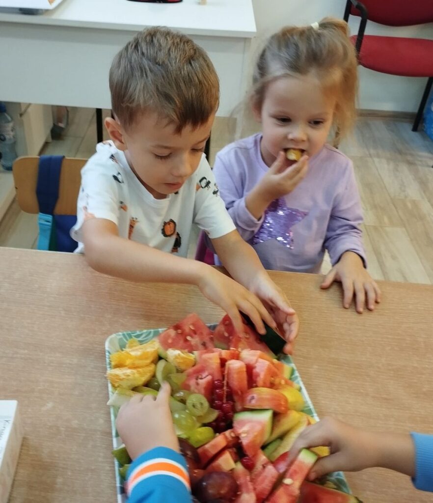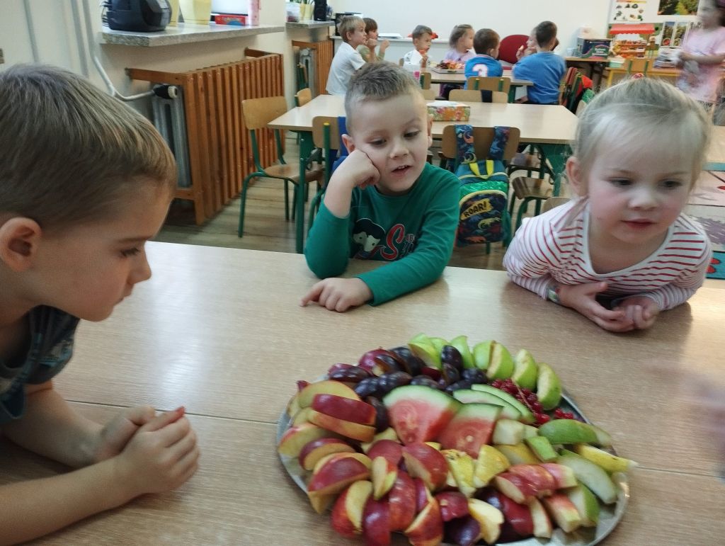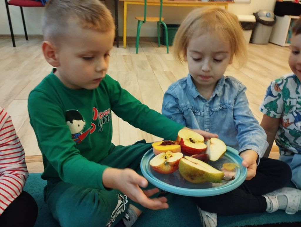 W minionym tygodniu, młodsze przedszkolaki, wyruszyły w fascynującą podróż po świecie owoców z polskich sadów i ogrodów. Podczas zajęć poznawały je wielozmysłowo – dotykały, oglądały, wąchały, smakowały, a także… zaglądały do środka. To była doskonała okazja, by nie tylko dowiedzieć się, jak wyglądają pestki i miąższ, ale też docenić różnorodność kształtów, kolorów i zapachów. Na zakończenie zajęć odbyła się degustacja – każdy mógł spróbować pysznych, soczystych owoców, które są prawdziwym skarbem jesieni.