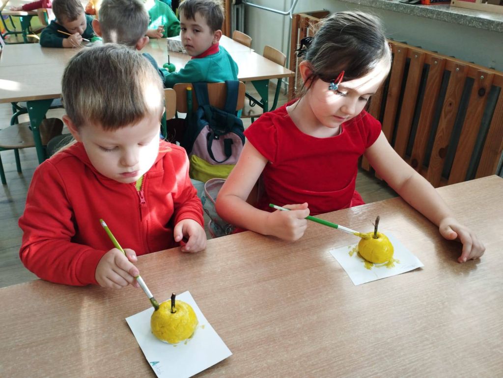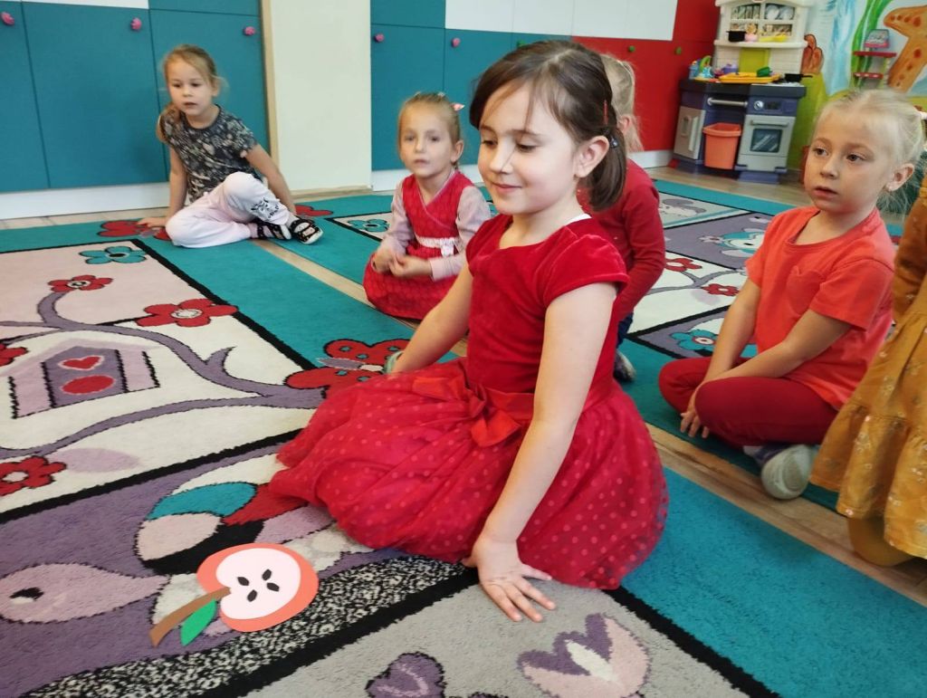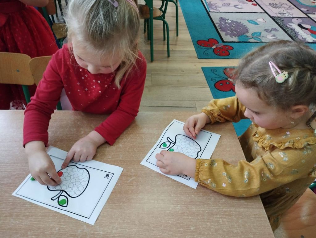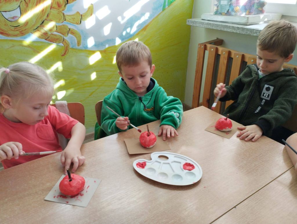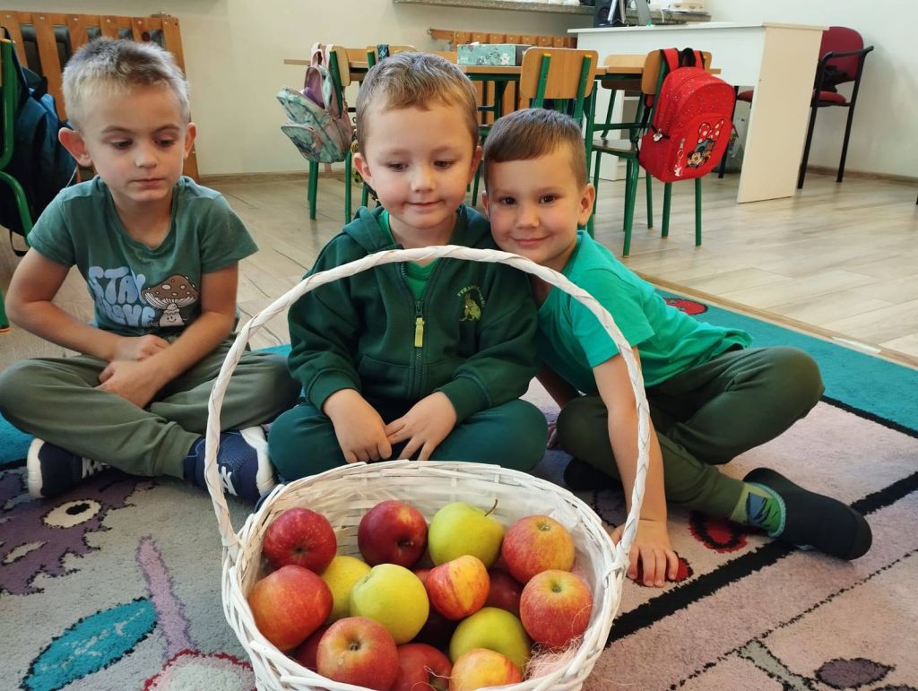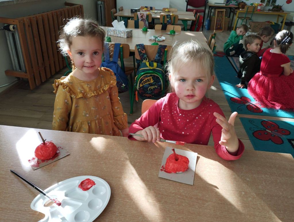 Po dawce wiedzy przyszedł czas na twórcze działania. Dzieci z entuzjazmem wzięły udział w zajęciach plastycznych, podczas których mogły wykazać się swoją kreatywnością. Malowały i wyklejały jabłka różnymi technikami, rozwijając przy tym swoją wyobraźnię i zdolności manualne. Powstały piękne, kolorowe prace, które z dumą ozdobiły naszą salę. Nie zabrakło również wesołych zabaw ruchowych z chustą animacyjną, które dostarczyły maluchom mnóstwo śmiechu.