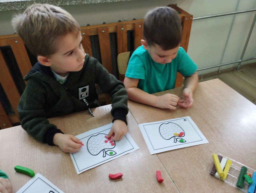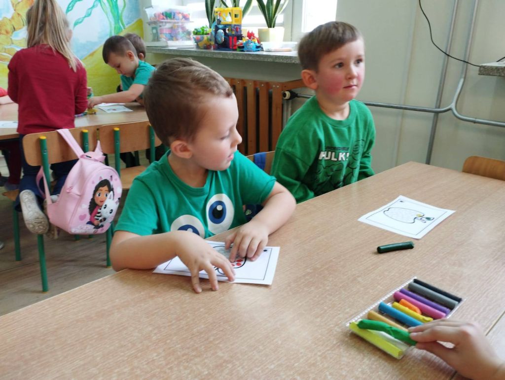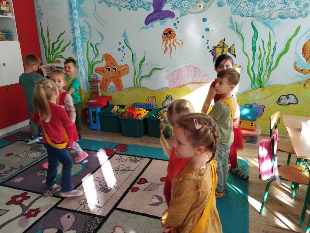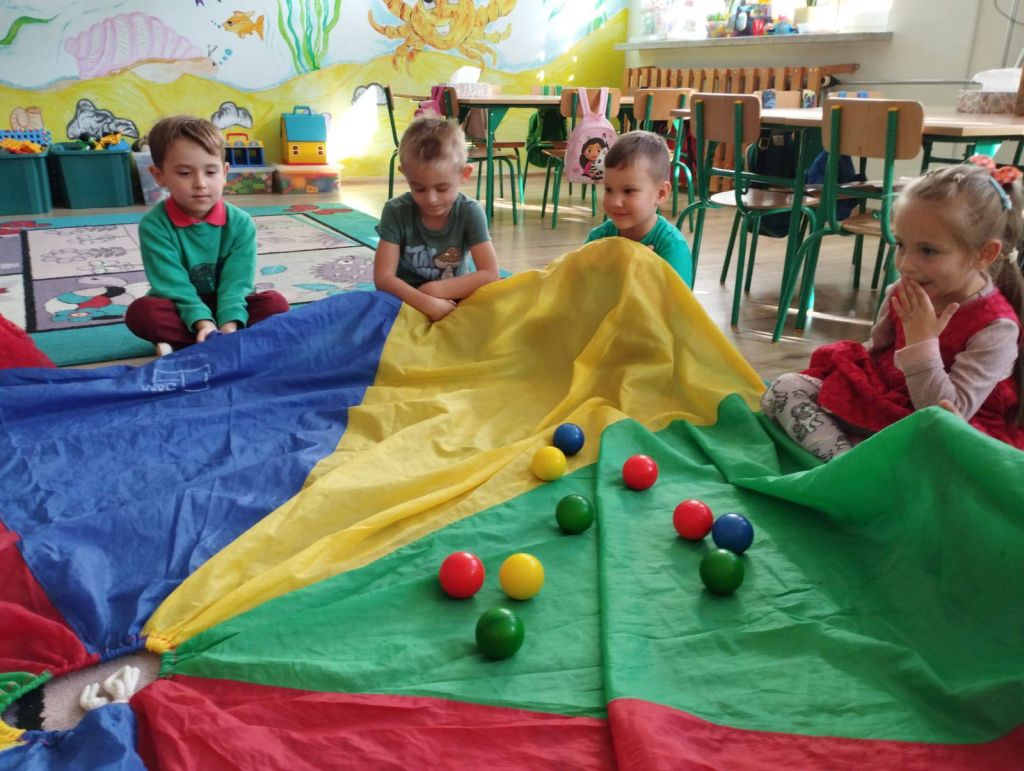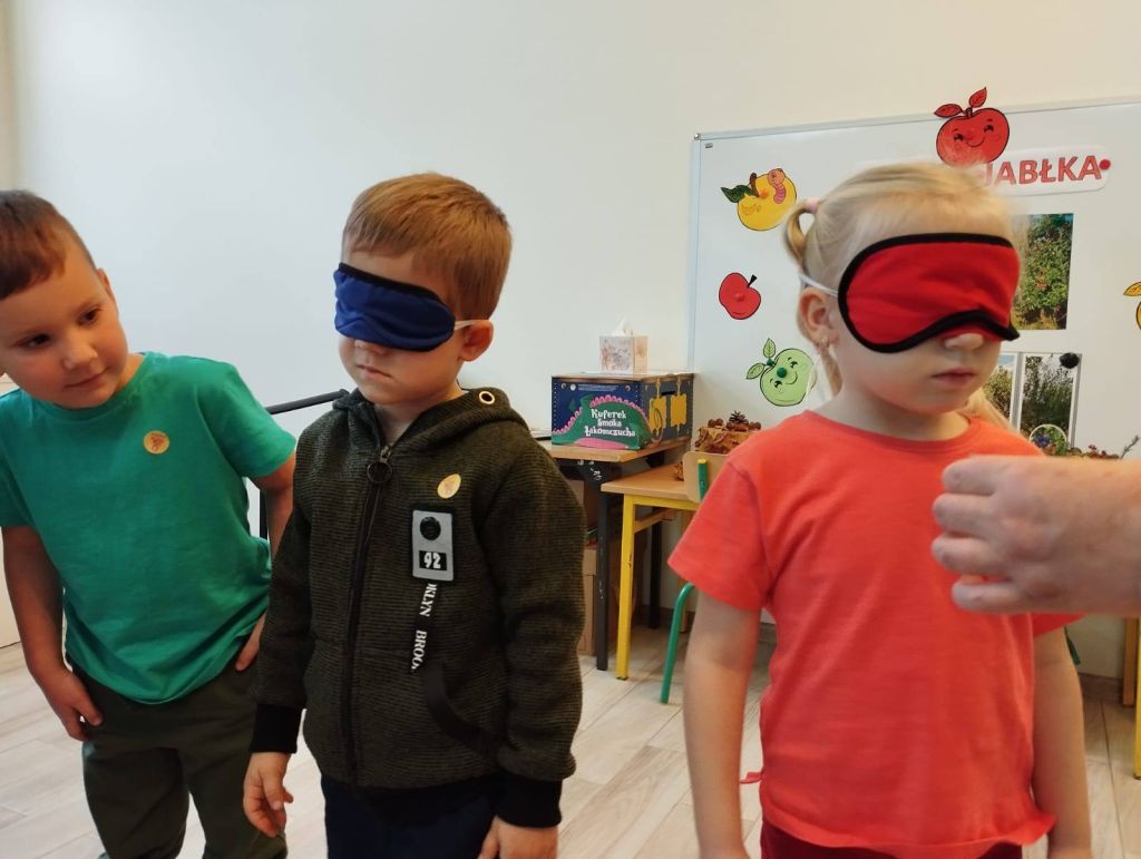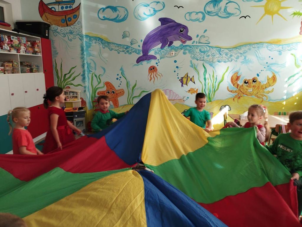 Po dawce wiedzy przyszedł czas na twórcze działania. Dzieci z entuzjazmem wzięły udział w zajęciach plastycznych, podczas których mogły wykazać się swoją kreatywnością. Malowały i wyklejały jabłka różnymi technikami, rozwijając przy tym swoją wyobraźnię i zdolności manualne. Powstały piękne, kolorowe prace, które z dumą ozdobiły naszą salę. Nie zabrakło również wesołych zabaw ruchowych z chustą animacyjną, które dostarczyły maluchom mnóstwo śmiechu.