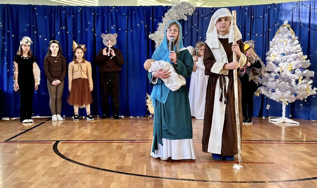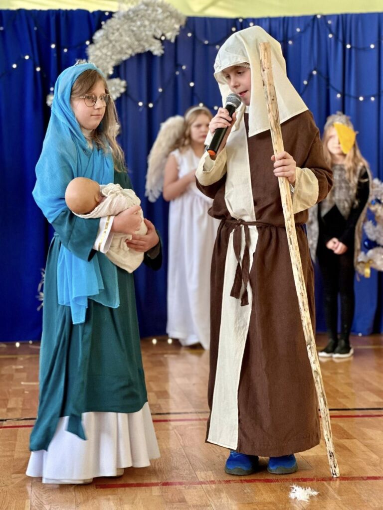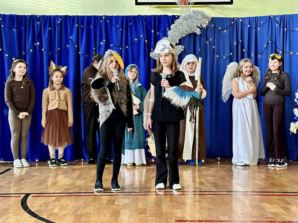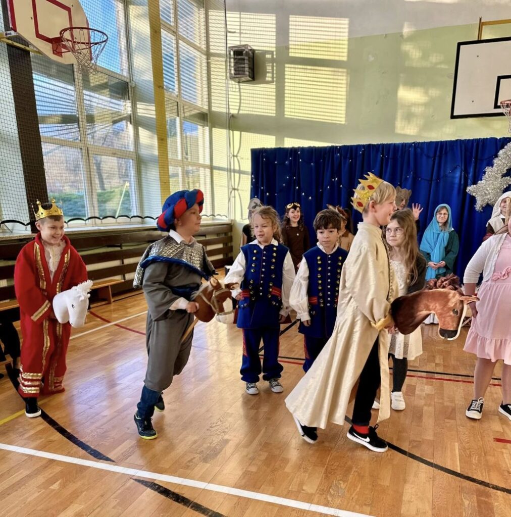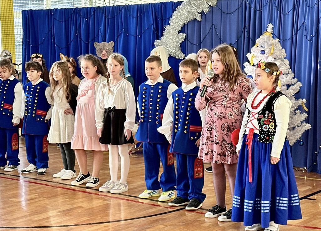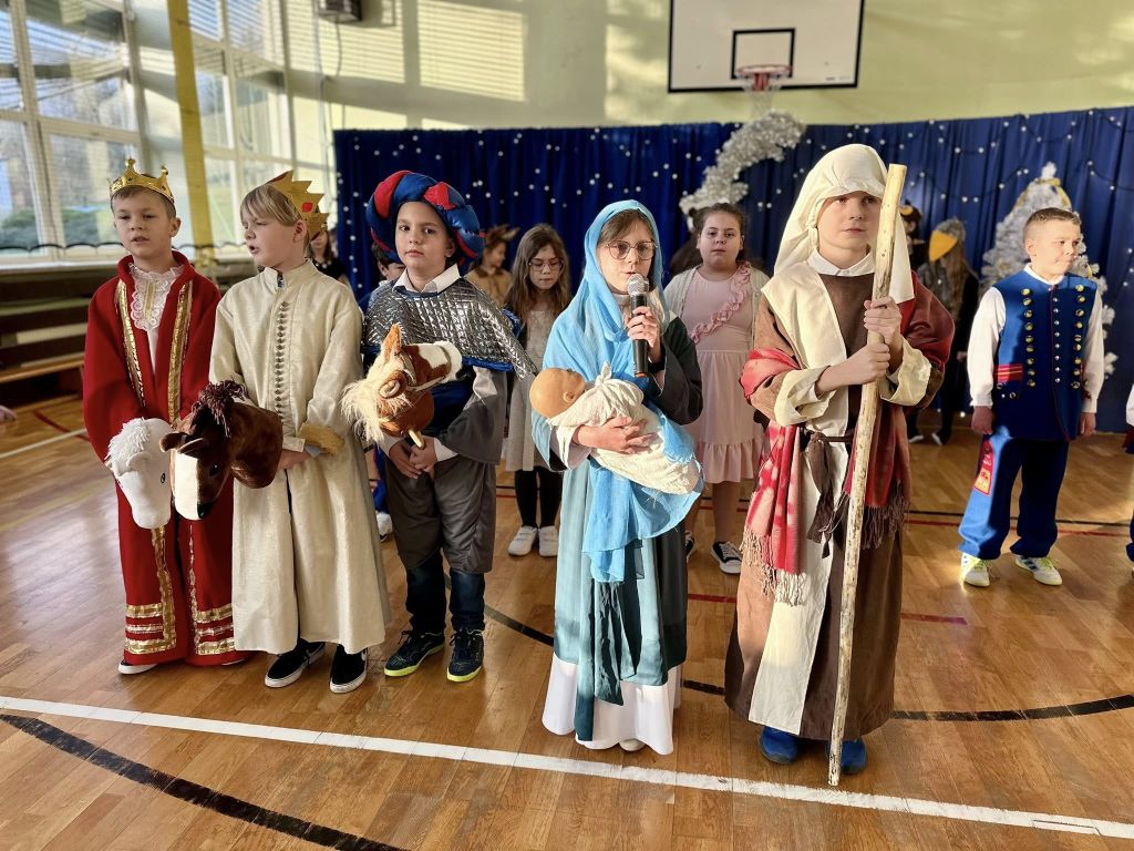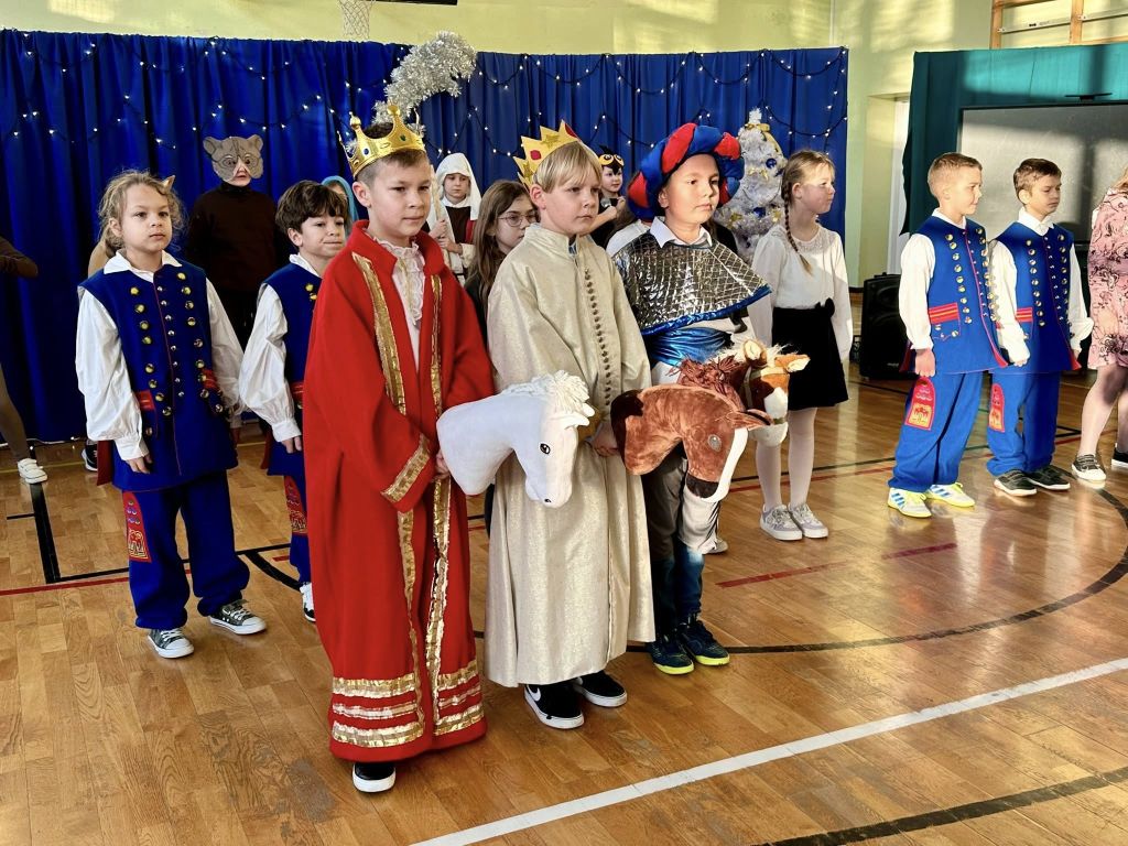Uroczystość rozpoczęła się od części artystycznej. Na scenie, na tle błękitnych kurtyn i błyszczących lampek, wystąpili uczniowie klasy III, którzy przygotowali tradycyjne jasełka. Młodzi aktorzy wykazali się ogromnym zaangażowaniem, a ich stroje budziły powszechny zachwyt – szczególną uwagę przykuwali trzej królowie dumnie prezentujący się na swoich „wierzchowcach” oraz uczniowie w pięknych strojach krakowskich.