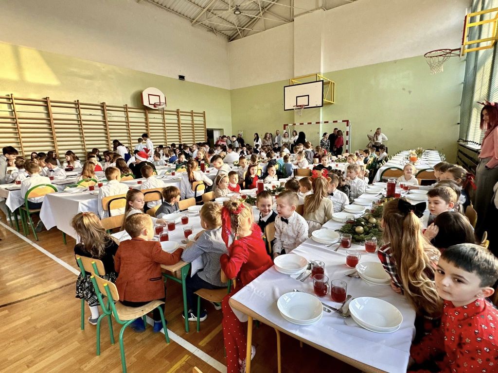 Po części oficjalnej przyszedł czas na wspólny posiłek. Długie stoły, nakryte śnieżnobiałymi obrusami i przyozdobione świerkowymi stroikami, zapełniły się całą społecznością szkolną. Przy tradycyjnym czerwonym barszczu i radosnych rozmowach mogliśmy poczuć prawdziwą więź, która łączy naszą szkołę.