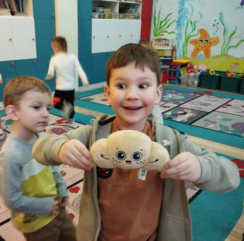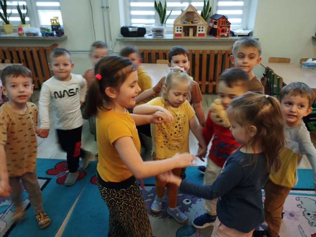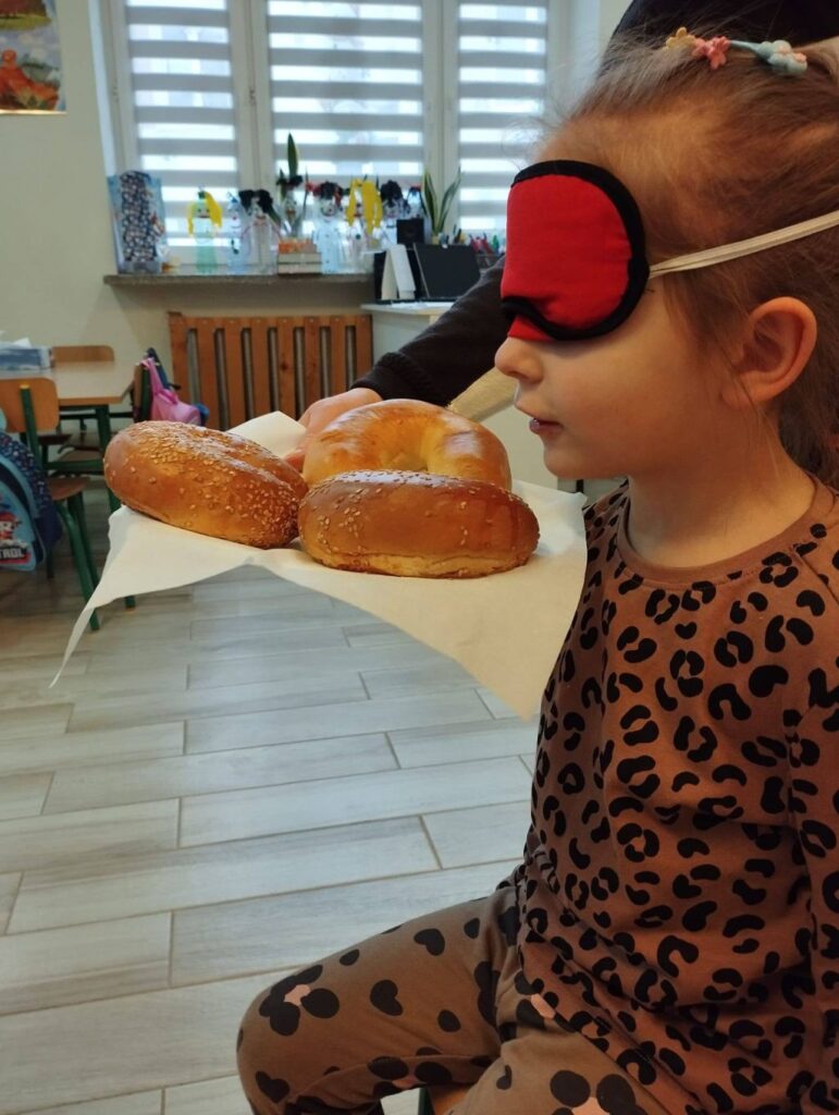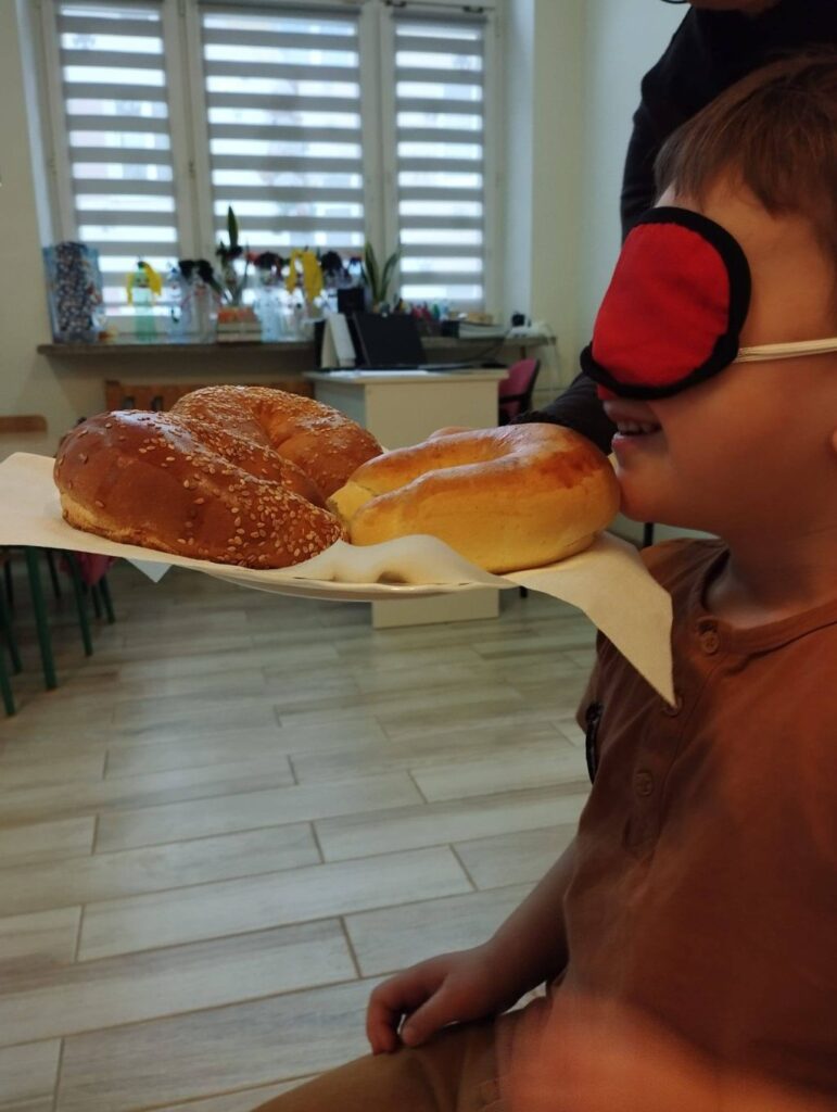 Dzień Rogalika to jednak nie tylko słuchanie, ale przede wszystkim działanie! Nie zabrakło zabaw sensorycznych i zagadek węchowych. Dzieci z zawiązanymi oczami musiały rozpoznać wypieki po samym zapachu, co okazało się świetnym treningiem zmysłów. Przedszkolaki chętnie brały też udział w zabawach ruchowych i kolorowaniu prac plastycznych.