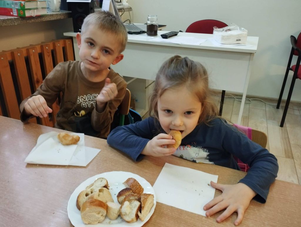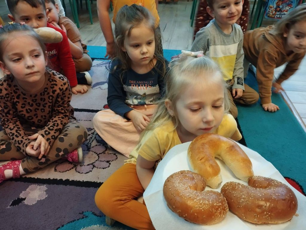 Podczas zajęć dzieci wyruszyły w podróż „Od ziarenka do rogalika”. Dzięki ciekawej historii dowiedziały się, jak powstaje mąka i ile pracy trzeba włożyć, aby na naszym stole zagościły pyszne wypieki. Dużo emocji wzbudziło też urocze opowiadanie o rogaliku, który miał wielkie marzenie – chciał zostać księżycem! 🌙