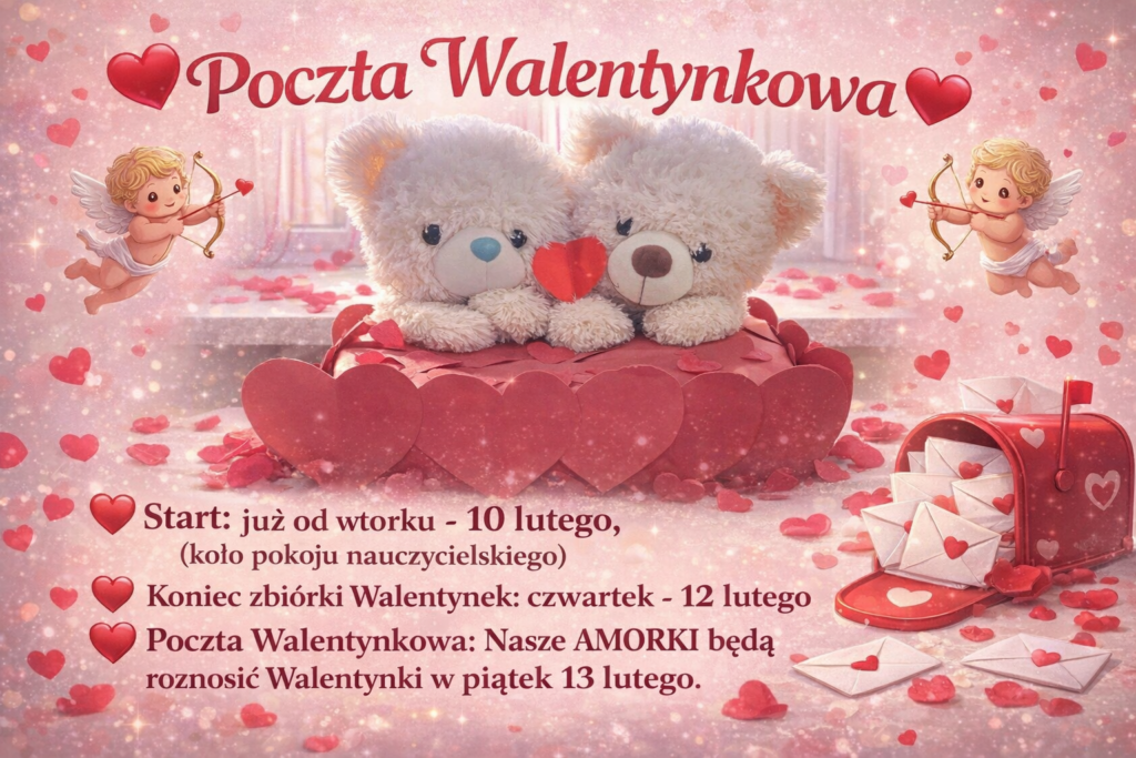 Zbliża się Dzień Świętego Walentego – święto przyjaźni, sympatii i miłych gestów! Z tej okazji zapraszamy wszystkich uczniów do udziału w naszej tradycyjnej Poczcie Walentynkowej.