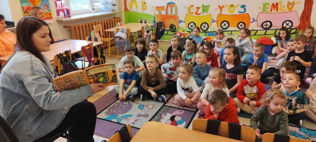 Dzieci nie tylko uważnie słuchały lektury, ale także chętnie dzieliły się swoimi wrażeniami i aktywnie uczestniczyły w rozmowie na temat przygód Franklina. Takie spotkania to doskonała okazja do rozwijania wyobraźni oraz budowania pozytywnych skojarzeń z książkami.