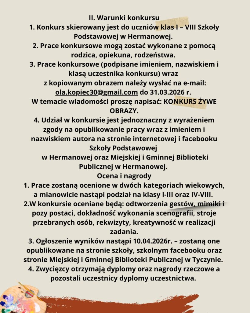 Konkurs skierowany jest do uczniów Szkoły Podstawowej w Hermanowej. Prace będą oceniane w dwóch kategoriach wiekowych: