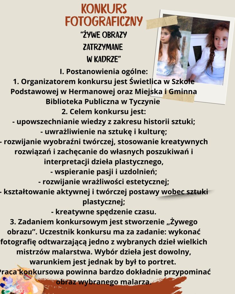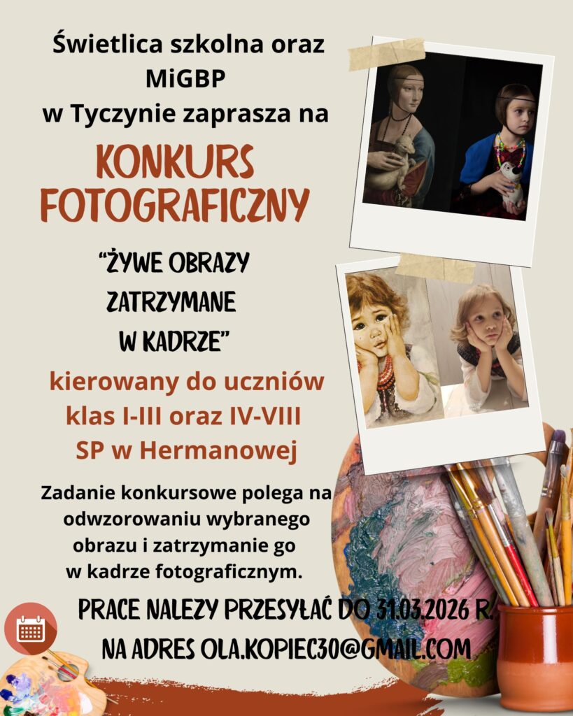 Świetlica szkolna w Szkole Podstawowej w Hermanowej oraz Miejska i Gminna Biblioteka Publiczna w Tyczynie serdecznie zapraszają wszystkich uczniów do udziału w niezwykłym konkursie fotograficznym pt. „Żywe obrazy zatrzymane w kadrze”.