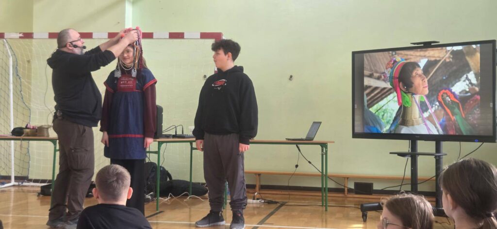 Najwięcej emocji wzbudziła jednak możliwość bezpośredniego zetknięcia się z tajską tradycją. Uczniowie mogli obejrzeć tradycyjne stroje i ozdoby, a chętni mieli nawet okazję przymierzyć charakterystyczne, mosiężne obręcze noszone przez kobiety z plemienia Padaung (tzw. „długie szyje”), co widać na załączonych zdjęciach.