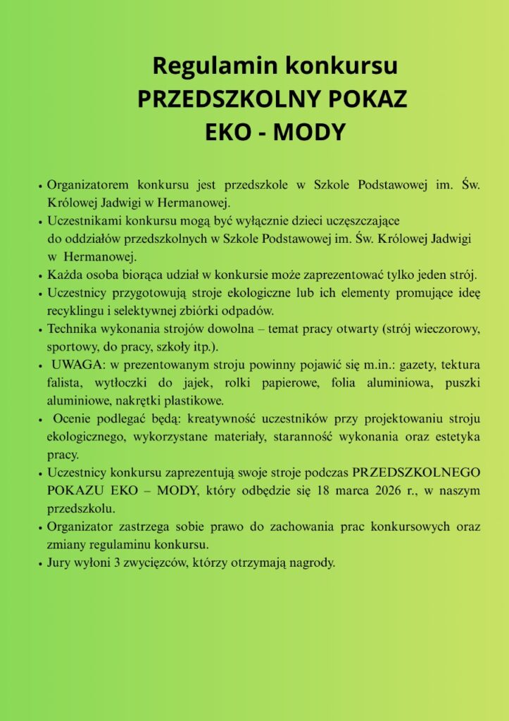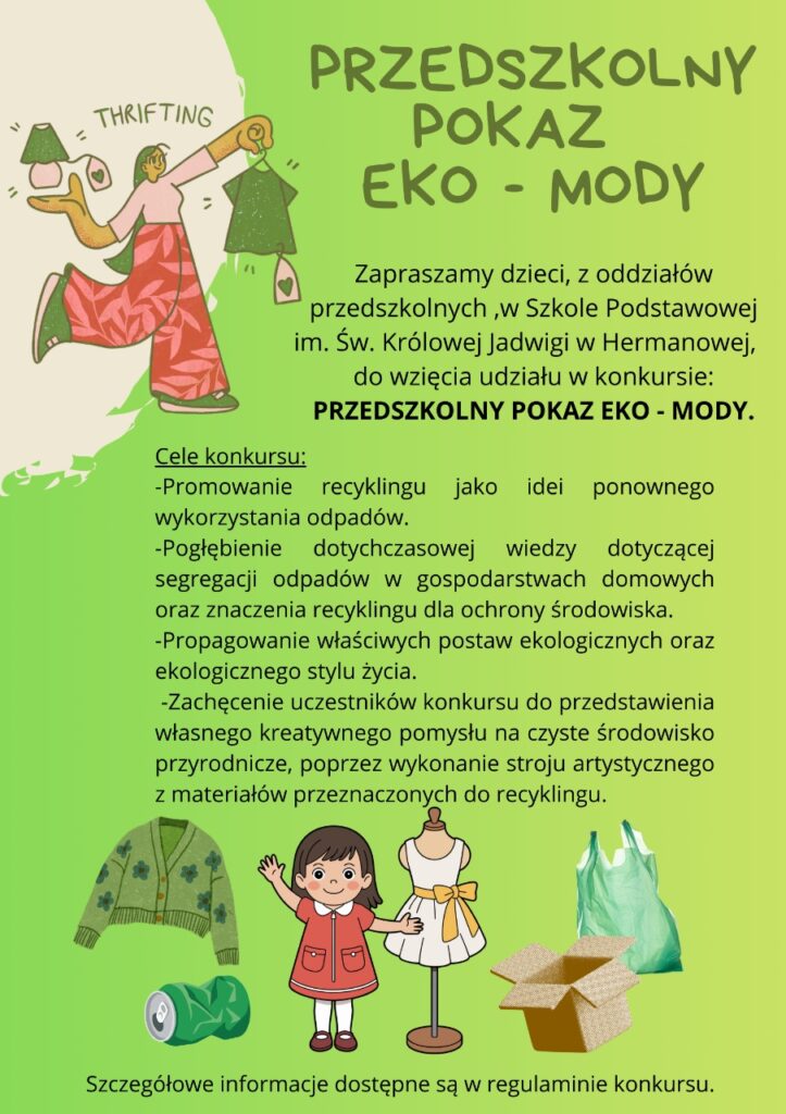 Czy moda może iść w parze z ekologią? Oczywiście, że tak! Serdecznie zapraszamy wszystkie dzieci z oddziałów przedszkolnych w Szkole Podstawowej im. św. Królowej Jadwigi w Hermanowej do wzięcia udziału w wyjątkowym konkursie: „Przedszkolny Pokaz Eko-Mody”.