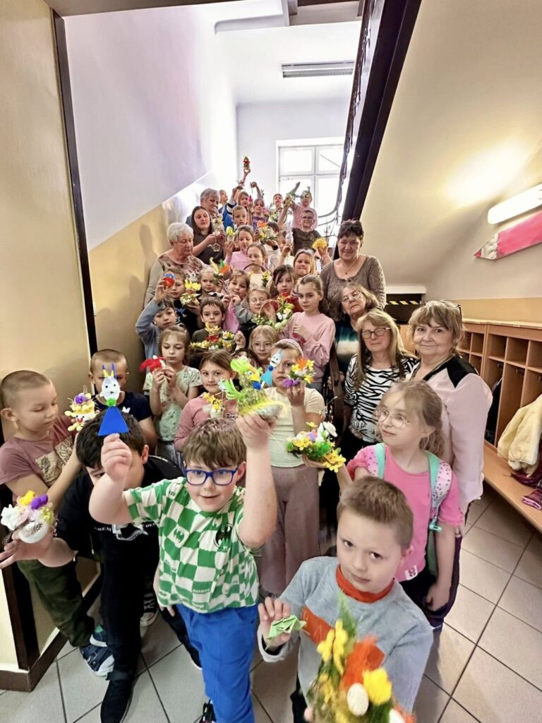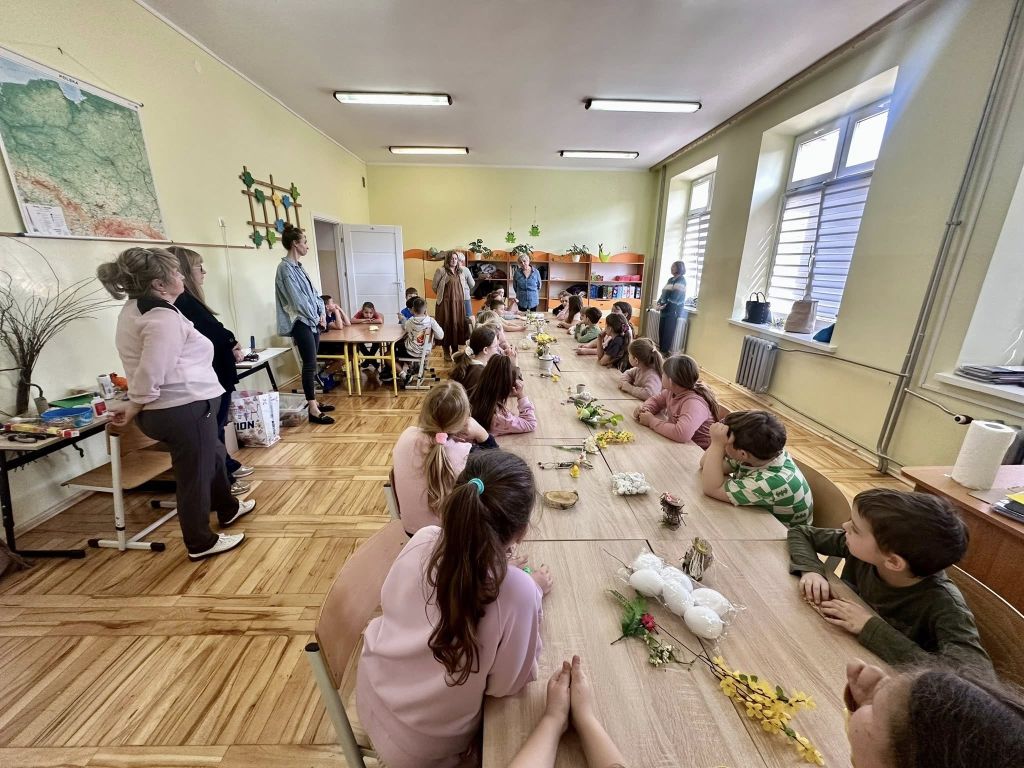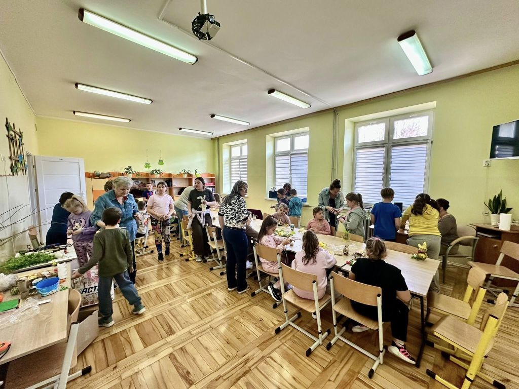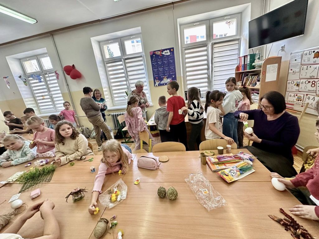 Jak widać na dołączonej fotorelacji, nasze ławki błyskawicznie zamieniły się w prawdziwe artystyczne pracownie. Dzieci z ogromnym zapałem i w pełnym skupieniu zabrały się do pracy. W ruch poszły farby plakatowe, pędzle, kolorowe włóczki, sianko i wielkanocne figurki. Zdolne ręce naszych uczniów, wspierane przez doświadczonych gości, wyczarowały przepiękne ozdoby – od ręcznie malowanych, barwnych pisanek, po urocze stroiki i wiosenne kompozycje.