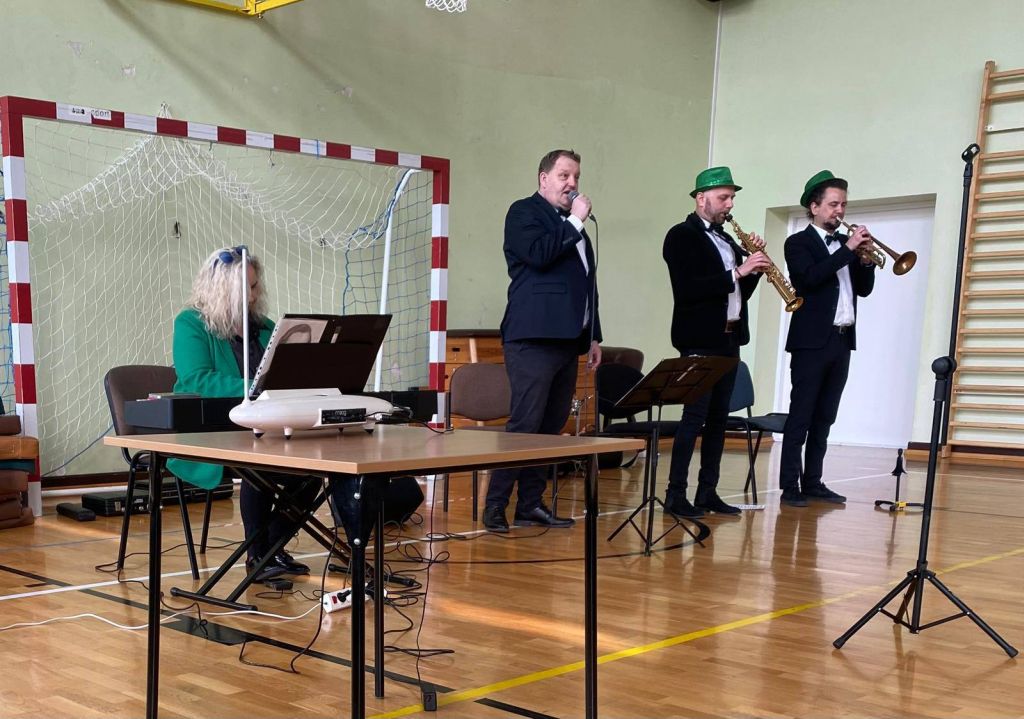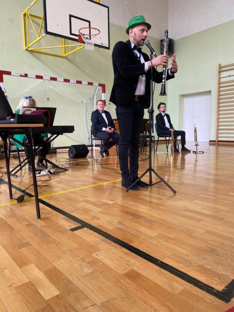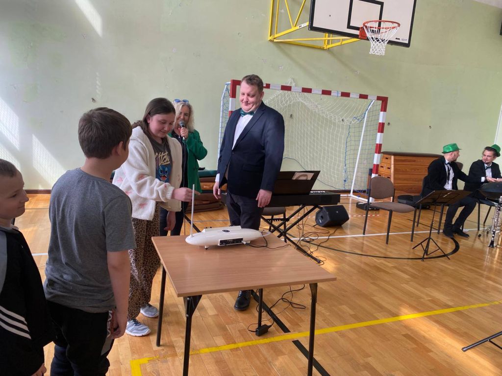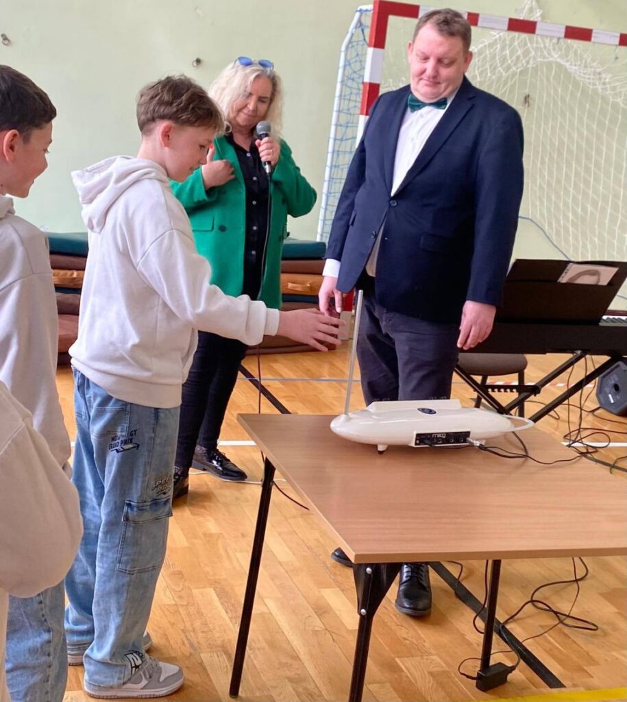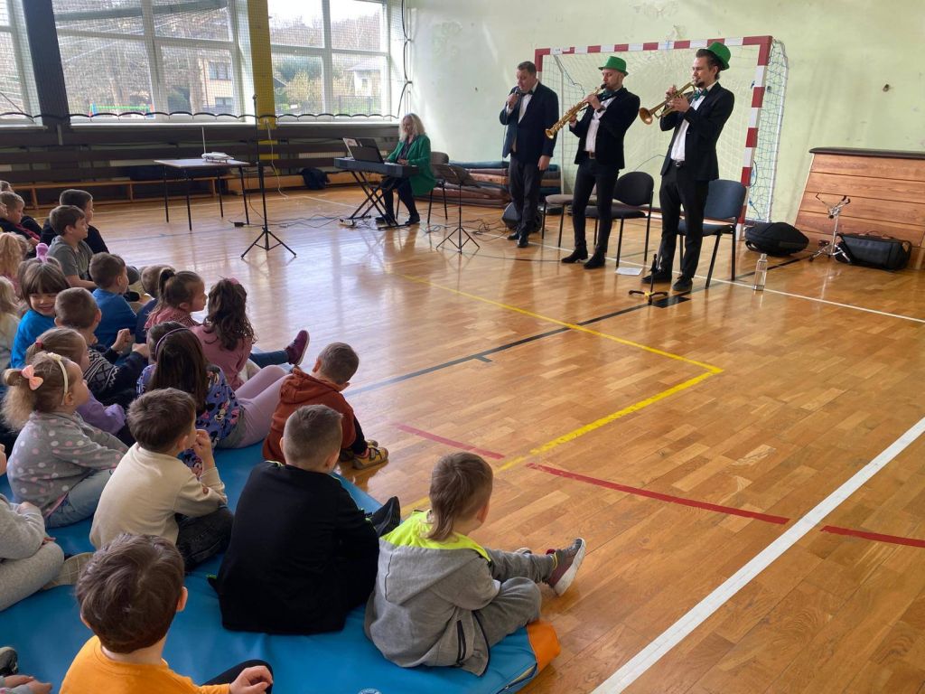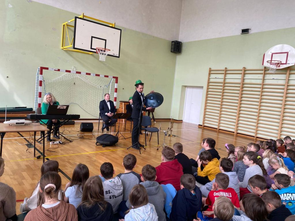 Podczas spotkania nasza sala gimnastyczna zamieniła się w prawdziwą salę koncertową. Uczniowie, wygodnie zgromadzeni na materacach, z ogromnym zainteresowaniem słuchali opowieści o muzyce i naturze. Artyści, których ekologiczne zaangażowanie podkreślały radosne, zielone kapelusze, zabrali nas w podróż przez różnorodne dźwięki i epoki.